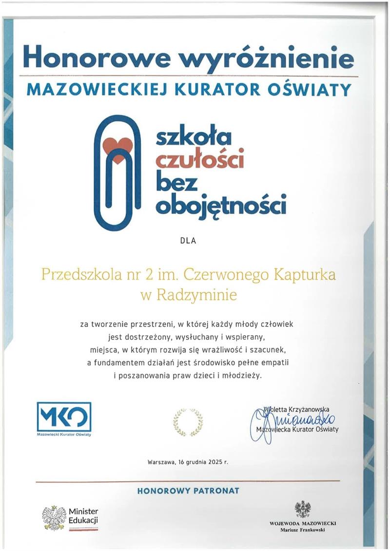 Przedszkole nr 2 im. Czerwonego Kapturka w Radzyminie jest publiczną placówką oświatową z 45-letnią tradycją pracy dydaktyczno-wychowawczej i opiekuńczej. Przedszkole łączy bogate doświadczenie z nowoczesnymi metodami edukacji, zapewniając dzieciom bezpieczne i przyjazne środowisko sprzyjające wszechstronnemu rozwojowi.