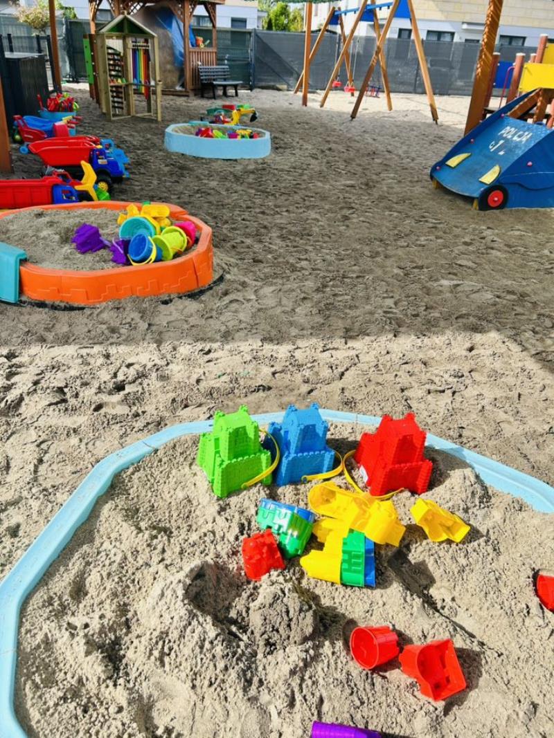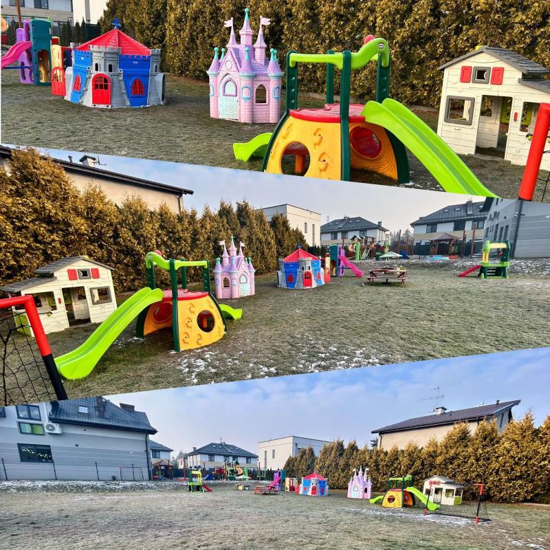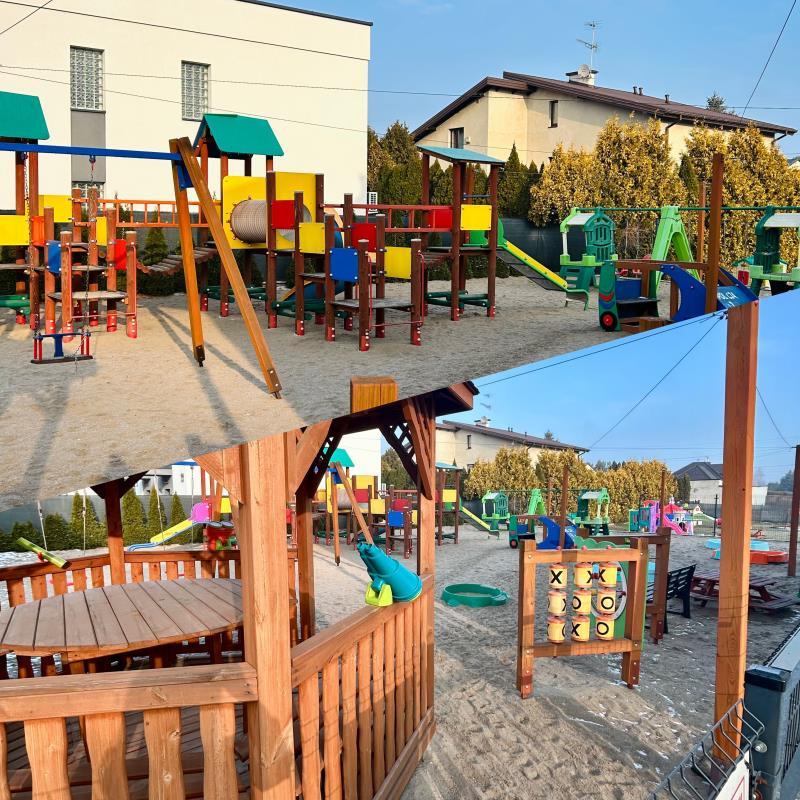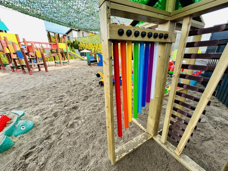 Na terenie placówki znajduje się również bezpieczny plac zabaw, podzielony na strefy dostosowane do możliwości rozwojowych dzieci. To przestrzeń, która zachęca do ruchu, współpracy i aktywnego spędzania czasu na świeżym powietrzu.